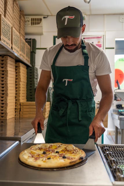 Nos pizzas sont préparées par nos pizzaiolos chaque jour. Afin de varier notre carte de pizzas, nous proposons également de nouvelles recettes chaque saison. Côté produits, nous privilégions des ingrédients frais et de saison et utilisons une sélection d’aliments labellisés AOP et IGP. Une fois préparées, les pizzas sont stockées au frais en attendant de passer au four une fois la commande validée. Nous nous engageons à proposer des pizzas fraîches et cuites sur le moment, avec la même saveur qu’en restaurant et toujours avec des ingrédients de qualité !