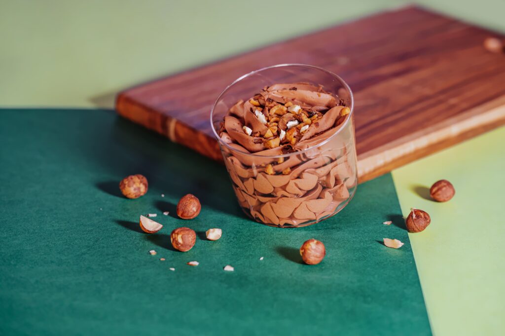 Mousse au chocolat, feuilletine, pralinée, éclats de noisettes.