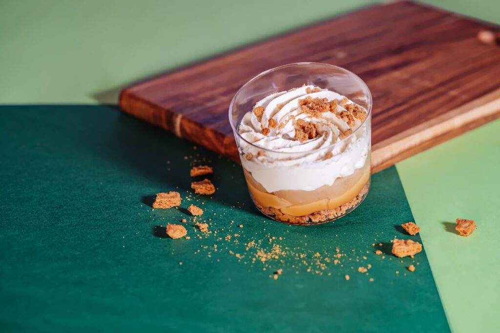 Crème au caramel beurre salé, comptée de bananes, crème fouettée, crumble speculoos.