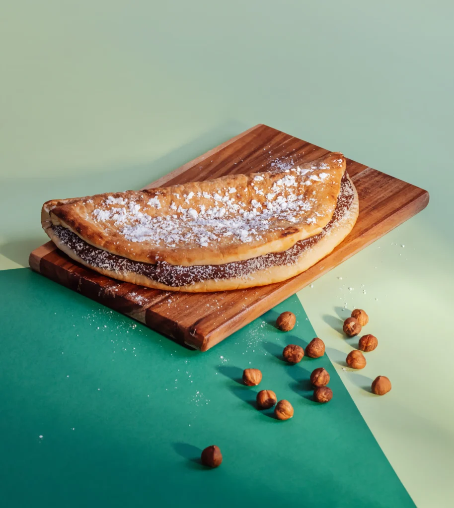 Pâte à pizza fourrée de Nutella, noix de coco râpée.