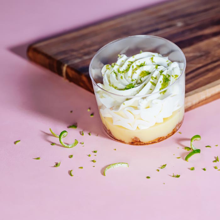 Crème de citron, crème fouettée, crumble d’amande, zeste de citron vert.