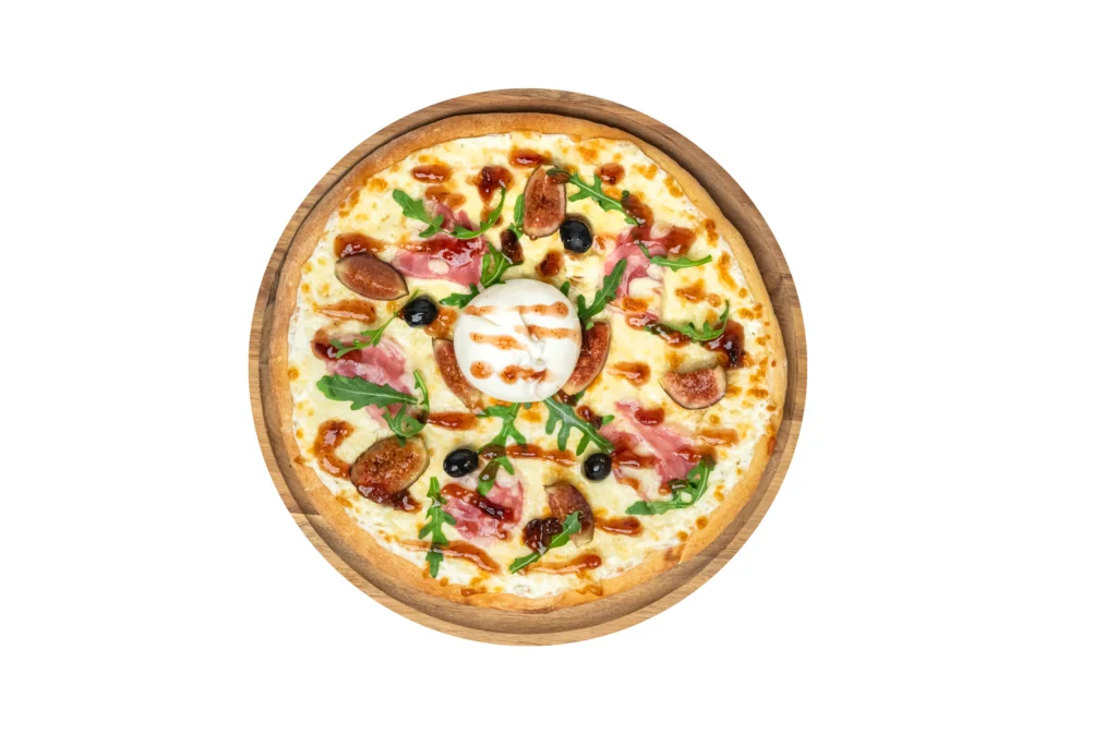 Sauce tomate, emmental français, mozzarella française, fromage de chèvre, filet de crème fraîche, olives.