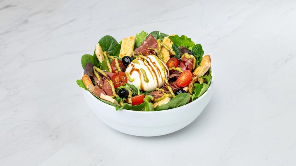 Mesclun, jambon de pays, tomates cerises, olives, burrata, pesto alla genovese, crème de balsamique de Modène IGP, Ti’pain.
