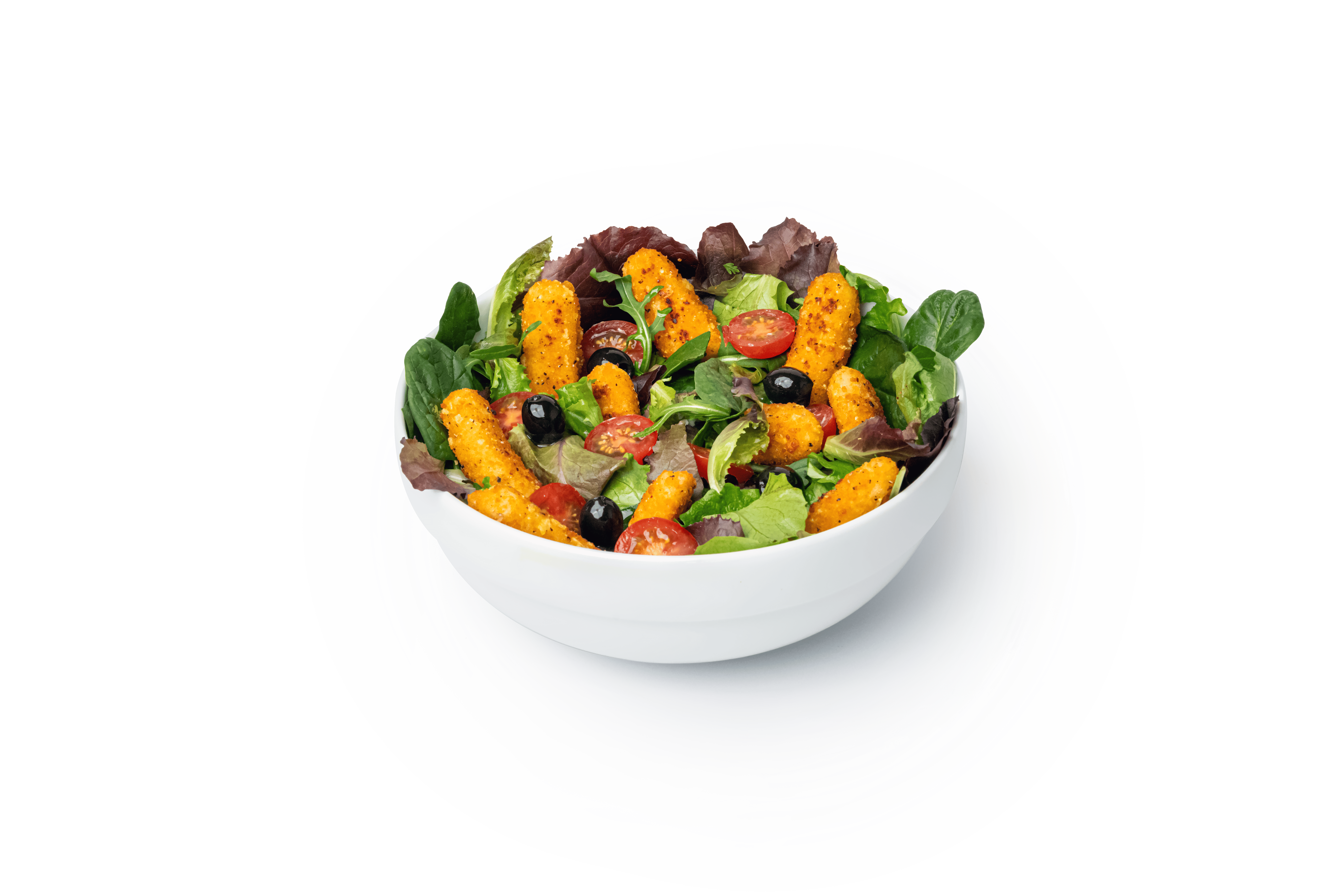 Mesclun, tomates cerises, olives, sticks mozzarella, Ti’pain.