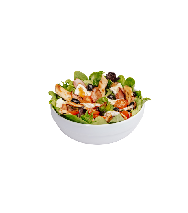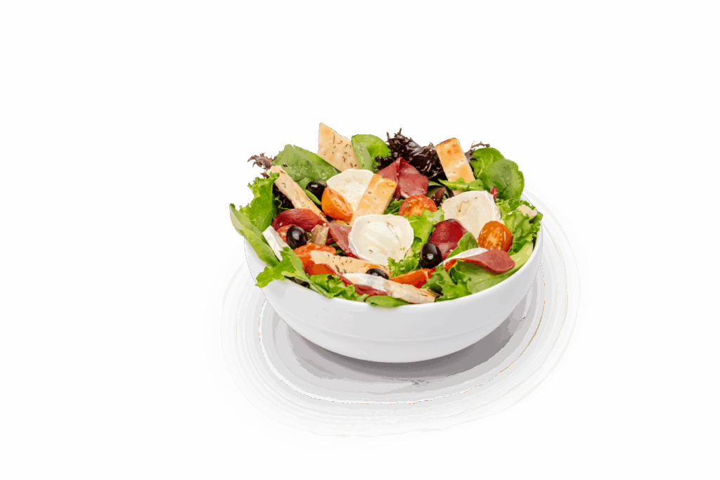 Mesclun, bacon grillé, tomates cerises, olives, camembert, confit d’oignons, thym, Ti’pain.