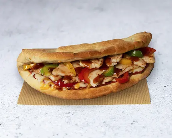 Sauce tomate, mozzarella française, émincés de poulet rôti, sauce barbecue, cheddar, poivrons frais.