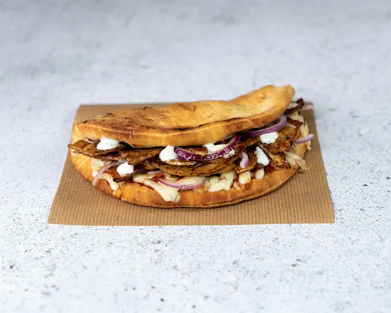 Sauce tomate, mozzarella française, viandes de kebab, sauce blanche, oignons rouges.