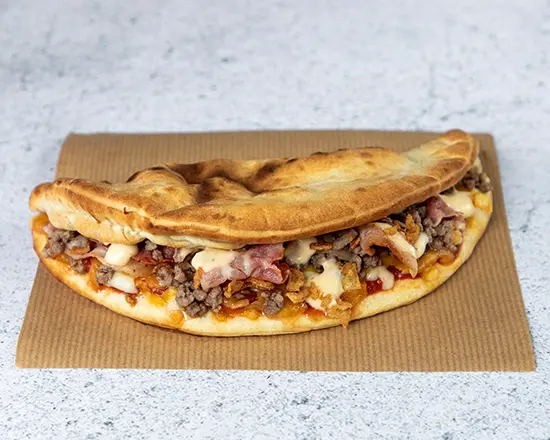 Sauce tomate, mozzarella française, bœuf haché, sauce burger, cheddar, bacon grillé, oignons frits.